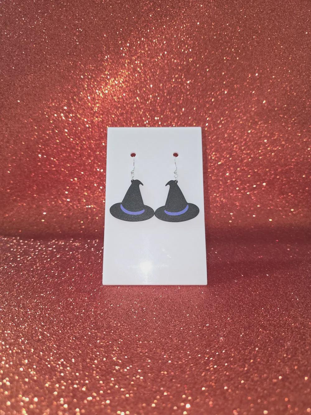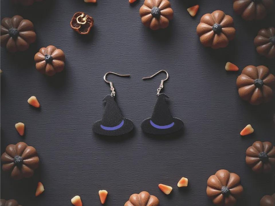 Cast a stylish spell this Halloween with these Witch Hat Earrings! 🎃✨ Featuring a sleek black hat with a deep purple band, these lightweight 3D printed earrings add the perfect touch of spooky sophistication to your fall wardrobe.