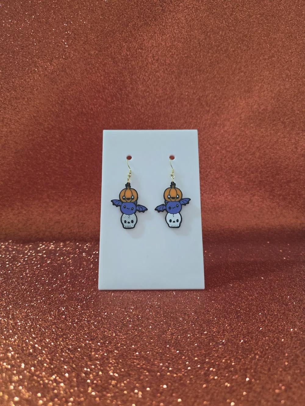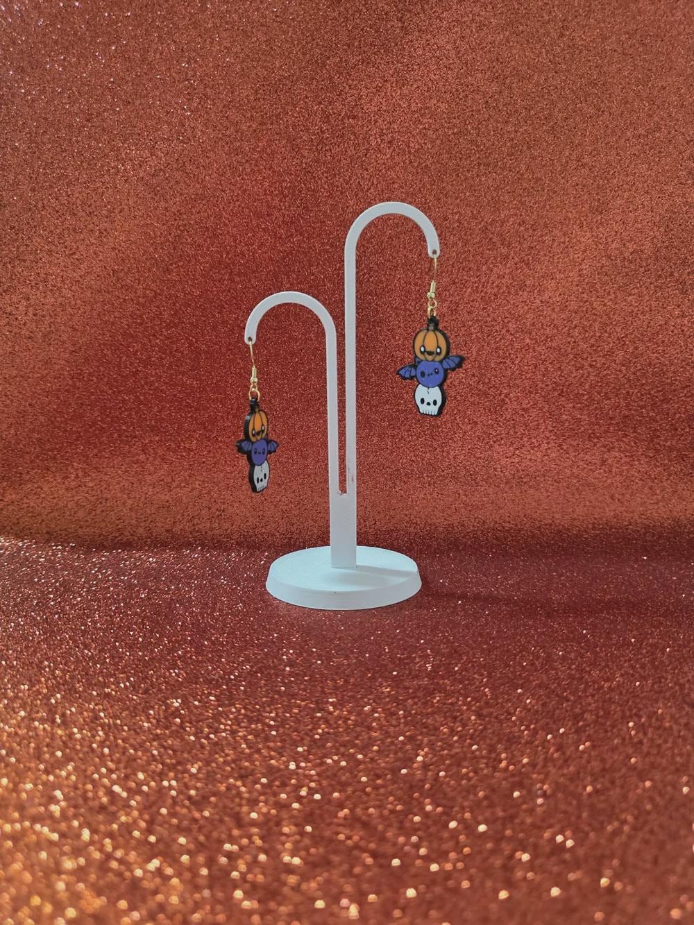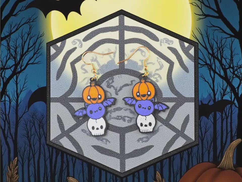 Add a touch of spooky-cute charm to your Halloween look with these Bat Stack Earrings! 👻🦇🎃 Each pair features an adorable 3-layer design — a grinning pumpkin, a cheerful bat, and a little skull — stacked together in fun Halloween colors. These lightweight 3D printed earrings are perfect for fall festivals, Halloween parties, or anyone who loves playful seasonal accessories.