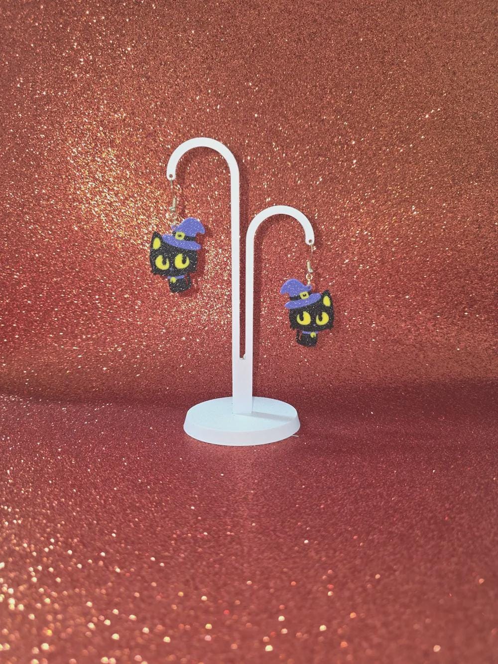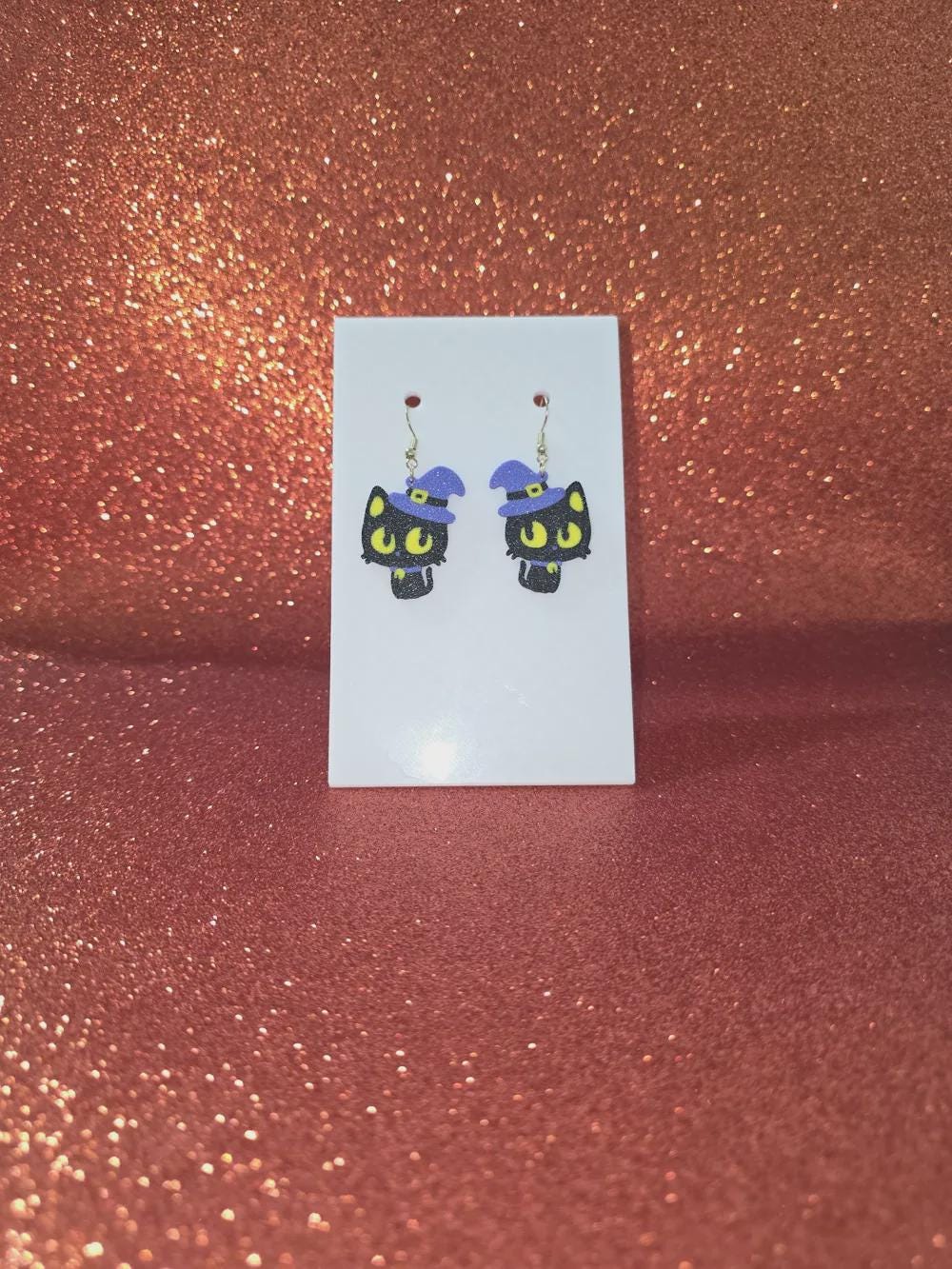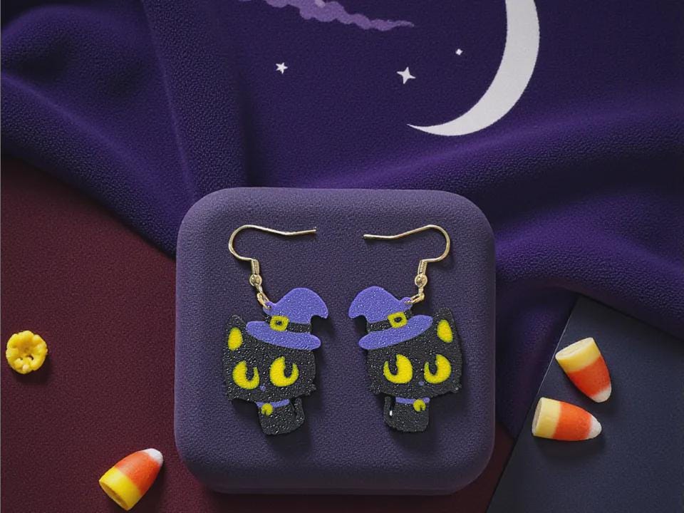 Each pair is 3D printed with precision and features a glittery black cat topped with a purple witch hat, complete with glowing yellow eyes. Lightweight and comfortable, they’re ideal for all-day wear—whether you’re trick-or-treating or just adding a touch of Halloween fun to your outfit!