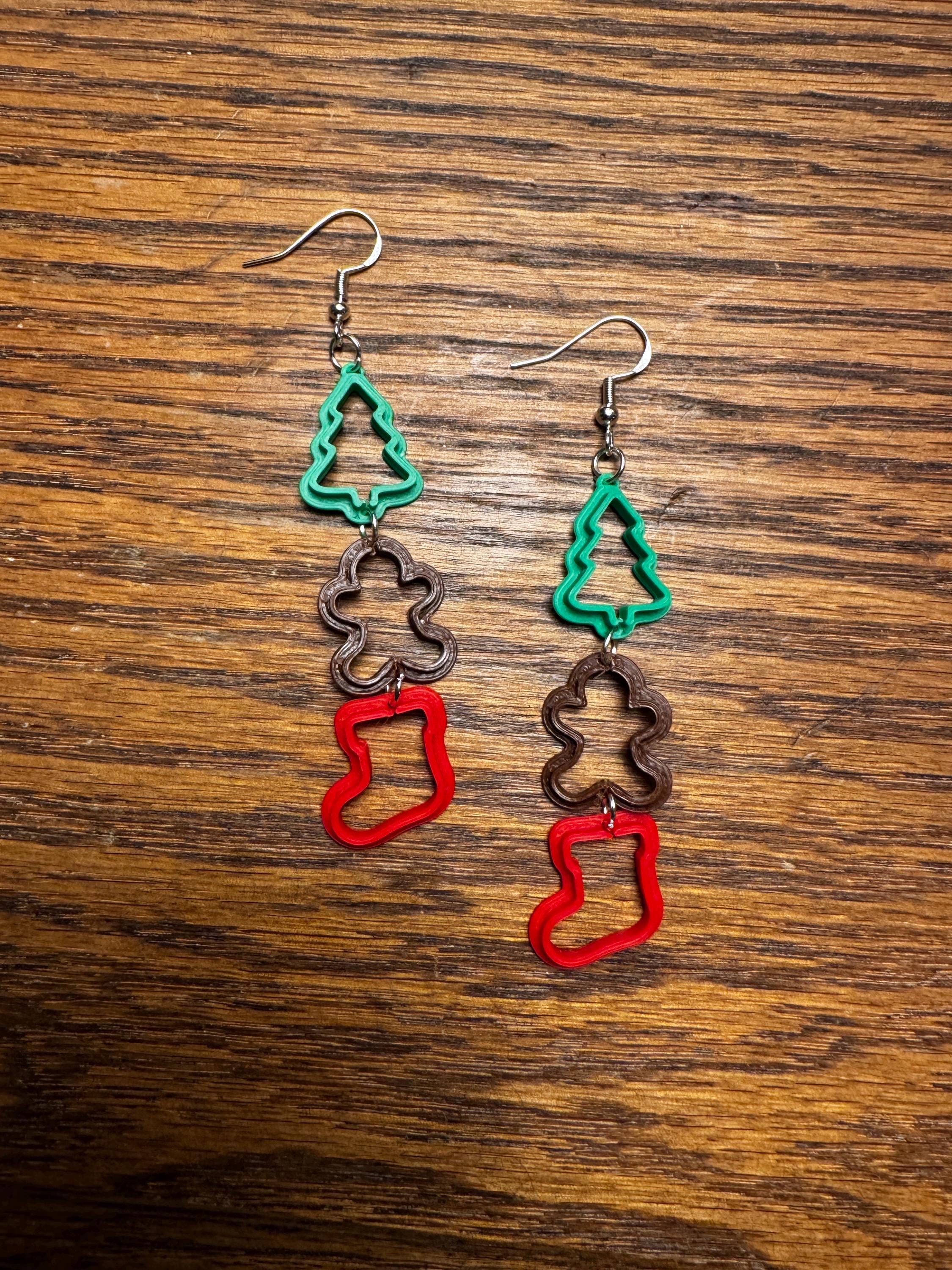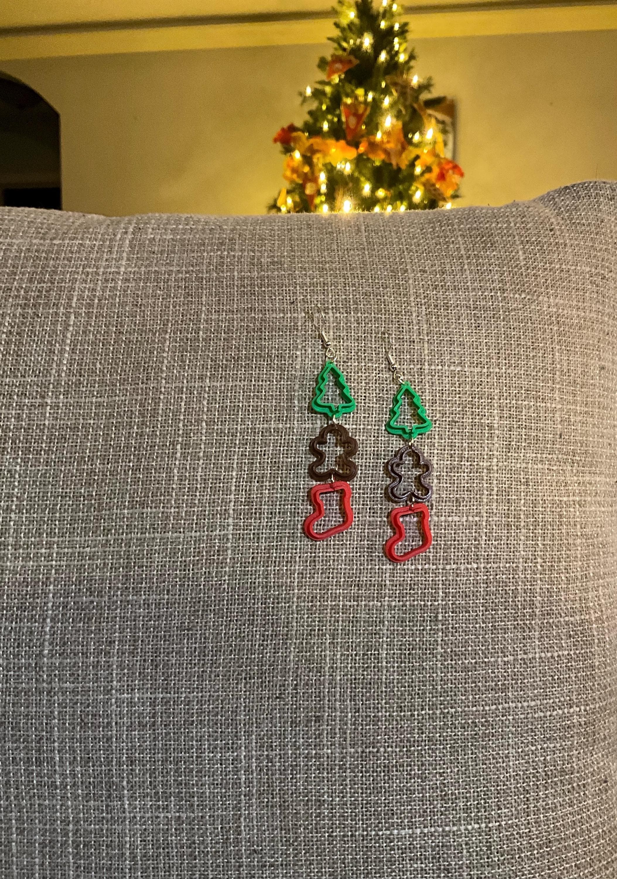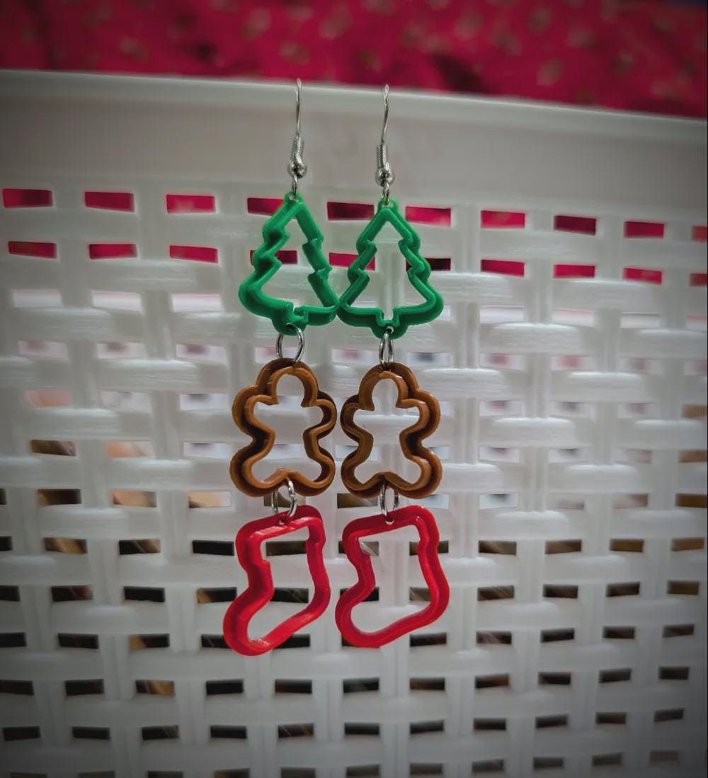Bring sweet holiday charm to your outfit with these adorable Christmas Cookie Cutter Earrings! Each pair features a trio of cookie-cutter–style charms: a green Christmas tree, a gingerbread person, and a bright red stocking. They’re lightweight, colorful, and perfect for adding a cheerful seasonal touch to any holiday celebration.
